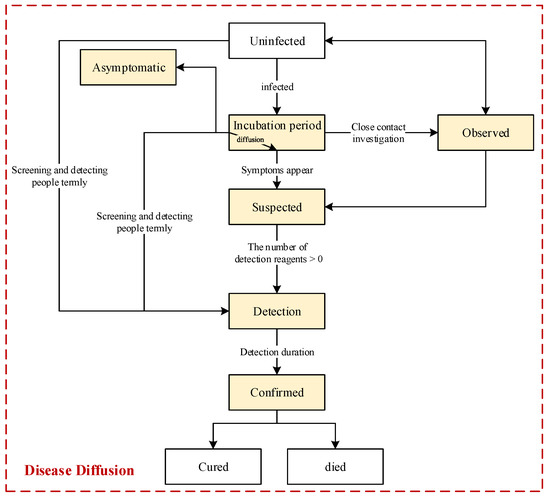 As shown in Figure 5, we designed the flow chart of disease diffusion. In the beginning, all the people are uninfected, and the first infected person emerges when exposed to the virus from areas outside of this crowd or when in contact with an infectious source in the environment. The infected person must experience an incubation period before the disease symptoms appear. During this period, the infected person has the potential to diffuse the virus to contact persons. When an infected person is viewed as a suspected case after developing disease symptoms or as a close contact person through epidemiological investigation, this person would be and needs to be detected. Hypothetically, infected people could be discovered and listed as confirmed cases once they are detected, and they would start to be treated and would be cured or would die after a treatment period.
