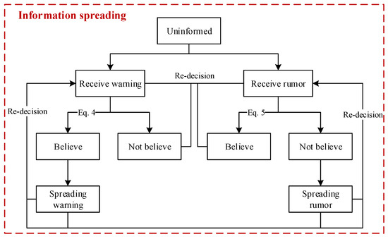 In addition, there are rumor disseminators during warning spreading, and people can receive warnings and rumors simultaneously. Similarly, a person who has received a rumor decides whether to believe it, and the decision depends on the person’s cognition and the current disease diffusion situation. As indicated in Equation (5), people will believe the rumor if ( denotes that the information is a rumor); otherwise, people will not. People who believe rumors will disseminate them to others.