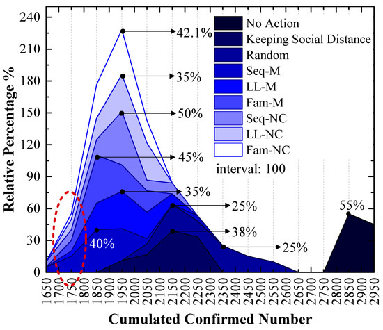 Although the stacked y-value of the peak point obtained by using Fam-M exceeds that obtained by using Seq-M, Seq-M is the most efficient strategy. As shown in the red circle of Figure 7, the stacked area before the peak point obtained by using Seq-M is larger than that obtained by using Fam-M. More simulation results are distributed to the left of the peak point obtained by using Seq-M. As shown in Figure 8, when Seq-M is used, the cumulative percentage with the 1850 x-value is larger than that when Fam-M is used.