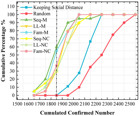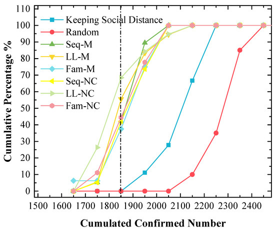 The cumulative frequency of cumulated confirmed cases using various strategies in the 1st scenario. The x-value of the dash line is 1850.