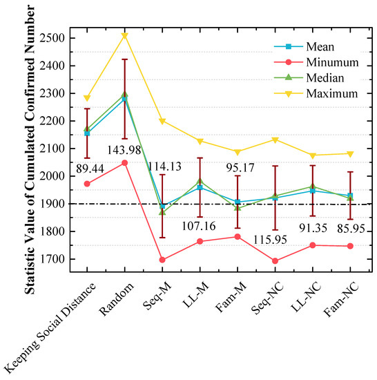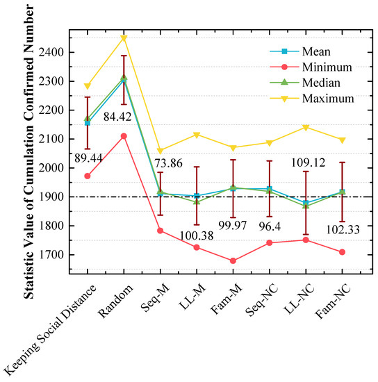 In addition, 20 cumulative confirmed numbers for each strategy are statistically analyzed in Figure 9, which shows the following: