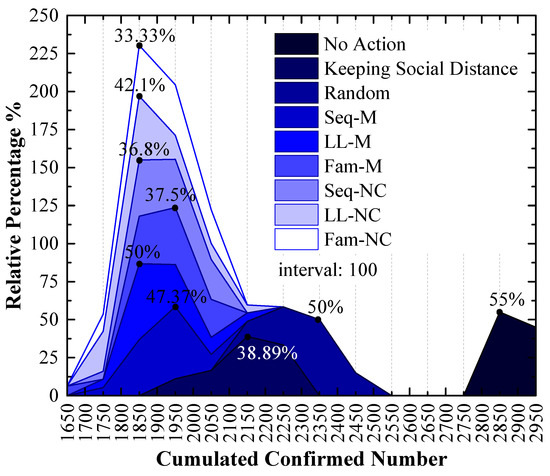 (a) In Figure 10, the order of x-values for peak points by using different strategies from small to large is LL-M (1850) = Seq-NC (1850) = LL-NC (1850) = Fam-NC (1850) < Seq-M (1950) = Fam-M (1950) < Keeping Social Distance (2150) < Random (2350) < No Action (2850). The strategy order of y-values for peak points with the 1850 x-value from large to small is LL-M (50%) > LL-NC (42.1%) > Seq-NC (36.8%) > Fam-NC (33.33%);