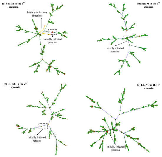 The only difference between the two results is the different applied scenarios. According to our above discussions, some diffused lines have grown for a while in the 1st scenario, which means that more people have been infected. Then, the infected individuals in the diffused lines would extend their diffusion in the local range. The increase in infectious edges in the diffused network depends on having more contacts with infected peoples. The individuals screened by Seq-M and Fam-M have more local contact with others, and they have more possibilities of contacting infected people or infecting others. Screening people according to the larger metrics or larger families provides higher accuracy. As shown in Figure 13b, compared to the results in Figure 13a–d, there are fewer red nodes in diffused lines (the red node has larger infections with others), which indicates that the infected individuals did not extend the virus over a wider range, and the people with larger numbers of contacts have been screened before they infect others when applying Seq-M in the 1st scenario.