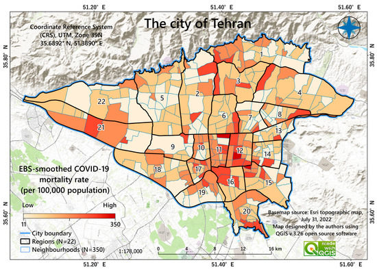 Map of Tehran, Iran, showing the spatial distribution of COVID-19 mortality 2019–2021; EBS = empirical Bayes smoothed mortality rates per 100,000 population at the neighbourhood level. Numbers indicate the administrative district division of the city. Each district includes some neighbourhoods.