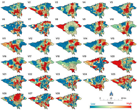 Spatial distributions for selected explanatory variables in Tehran, Iran. Dark blue shades show low ranges and dark red shades show high range values for each variable (numbers as given in Table 1).