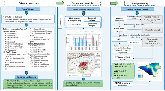 Pearson’s correlation coefficient and R2 correlation were used to explore the global and linear correlation between COVID-19 mortality rates (per 100,000 population) and exploratory variables. Mirrored scatter plot matrix was used to visualize the bivariate relationships between combinations of variables. Each scatter plot in the matrix visualizes the relationship between a pair of variables [89]. According to Pearson’s coefficient and R2 values, five variables (including V7, V23, V25, V27, and V28) were removed from the list of explanatory variables (Supplementary Files S5 and S6 for details). Mirrored scatter plot matrix shows the global relationships between COVID-19 mortality rates and all selected explanatory variables in Tehran based on Pearson’s correlation test (Supplementary File S6). The methodology flowchart of this research is shown in Figure 3.