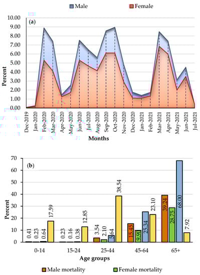 (a): Monthly distribution chart of the mortality rates (per 100,000 population) by number and sex; (b): percentage of COVID-19 related deaths by number, sex, and age group.