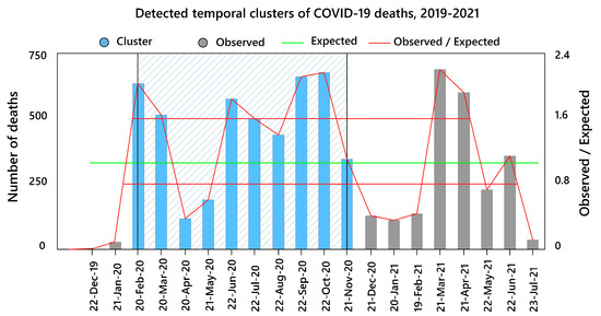 The purely temporal pattern of COVID-19 deaths is shown in Figure 5. Four peaks of COVID-19 deaths over the study period were observed. COVID-19 deaths peaked in September and October 2020 and from March to April 2021. In addition, statistically significant clusters (LLR value = 523.4, p < 0.05) were formed during the months of February 2020 to November 2020.