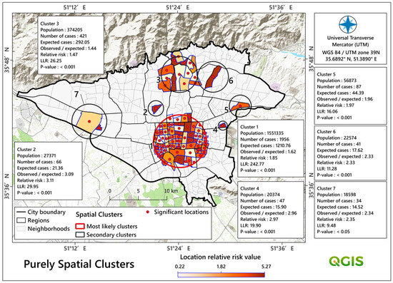 Detected purely spatial clusters of COVID-19 deaths in Tehran, Iran.