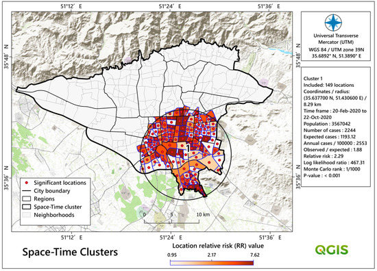 As Figure 7 shows in more detail, we identified only one significant space-time cluster (LLR = 467.31 and RR = 2.29, p < 0.05). This cluster consists of 75 neighbourhoods with a population of about 3,567,000. In addition, this cluster formed from February to October 2020 (nine months), which corresponds to the temporal clustering pattern (Figure 5). This cluster extends from the centre to the south and southeast areas of the city.
