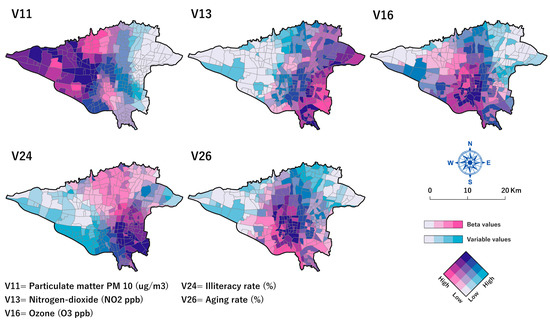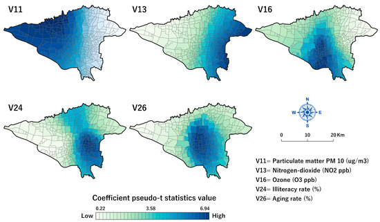 In the following step, exploratory regression was used to model linear relationships and select the most important variables for the OLS analysis while considering multicollinearity. While exploratory regression is similar to stepwise regression, rather than only looking for models with high adjusted R2 values, exploratory regression looks for models that meet all of the requirements and assumptions of the OLS model. The variance inflation factor (VIF) indicates multicollinearity, and values between 5 and 10 are recommended, with 10 as the maximum VIF level [86,90]. The max VIF was set at 7.5, as ESRI recommended [91,92], and the model was executed eight times to select the final significant variables. Based on these exploratory regression results, the variables V11 (PM10), V13 (NO2), V16 (O3), V24 (illiteracy rate), and V26 (proportion of elderly) as variables with the highest significance (≥60%), which explain the highest adjusted R2 (≥0.5), were included in our OLS model (Supplementary File S7). Based on these values, an OLS multivariate regression model was examined to explore the spatial autocorrelation of residuals (see Supplement File S8 for details). The technique assumes a stationary and constant relationship over space [92]. Using Moran’s I, we looked for the presence of OLS residuals and spatial autocorrelation within the study area. The value of Moran’s I varies between +1 and −1 [64], where a value close to 1 represents strong spatial autocorrelation [93]. We then employed the GWR model (Supplementary File S9 for details), an extension of the basic OLS standard regression, reflecting the variables’ distribution’s spatial heterogeneity [94]. The model can estimate and generate a set of local parameters, including adjusted R2, the corrected Akaike’s information criterion (AICc), local coefficients, and residuals for each spatial unit to examine the spatial variation of the relationship between response and explanatory variables [95].