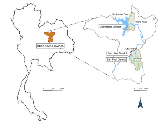 Study areas of Ubolratana District, Ban Haet District, and Ban Phai District of Khon Kaen Province. The association of study areas and water reservoirs was described.