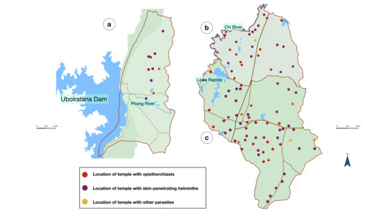 - Saenna, P.; Hurst, C.; Echaubard, P.; Wilcox, B.A.; Sripa, B. Fish sharing as a risk factor for Opisthorchis viverrini infection: Evidence from two villages in north-eastern Thailand. Infect. Dis. Poverty 2017, 6, 66. [Google Scholar] [CrossRef] [PubMed]
