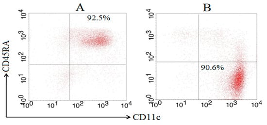 Purity of splenic cDCs and pDCs after MACS sorting based on FACS. Splenic pDC was prepared using a WSC suspension, and splenic cDC was subsequently prepared using the negative fraction of the pDC purification by MACS sorting after staining with anti-mPDCA-1 and CD11c microbeads, respectively. The purity of the pDC (A) and cDC (B) subsets was determined using FACS Calibur after staining with FITC-labeled anti-CD11c and PE-labeled anti-CD45RA MAbs.