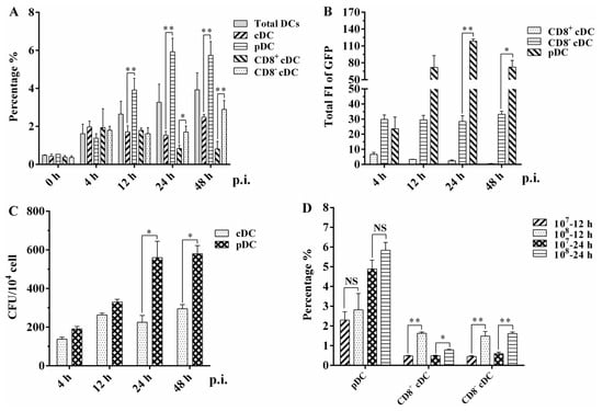 Infection analysis of different splenic DC subsets in mice injected with rBCG-GFP: (A) Infection rate of murine splenic total DC, cDC, pDC, CD8+ cDC, and CD8− cDC was analyzed using FACS at different hours post-infection (p.i.). (B) Total GFP fluorescence intensity (FI) of murine splenic CD8+ cDC, CD8− cDC, and pDC was calculated by the mean GFP FI multiplied the cell number of each DC subset among 104 splenic cells. (C) CFU counting of intracellular rBCG-GFP in splenic cDC and pDC subsets; (D) infection rate of splenic CD8+ cDC, CD8− cDC, and pDC subsets when mice were immunized with different CFUs of rBCG-GFP. The experiment was repeated three times, and data are shown with the mean value of the three independent experiments. The bar graphs show the mean ± SD. * p < 0.05; ** p < 0.01; NS, no significance.