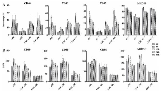 The results of infection rate and intracellular bacteria counting revealed the ability of different mouse splenic DC subsets to internalize BCG bacilli during in vivo infection. To determine whether BCG infection induced the maturation of DC subsets, we analyzed the cell surface marker expression of splenic cDC, pDC, CD8+ cDC, and CD8− cDC from naive or BCG-immunized mice, including the costimulatory molecules CD40, CD80, and CD86, and MHC class II (MHC-II) molecules, using FACS. An increase in the percentage of surface molecule-positive cells was observed for each DC subset infected with BCG compared with the PBS control (Figure 3A). In particular, splenic cDC expressed higher levels of CD40, CD80, and CD86 from 4 h to 48 h post-infection compared with 0 h, especially at 4 h, with values of 21.1% ± 5.3 (p = 0.028), 48.1% ± 5.0 (p = 0.018), and 36.2% ± 3.1 (p = 0.009), respectively. A similar expression of CD40, CD80, CD86, and MHC-II was observed for CD8+ cDC and CD8− cDC, aligning with the results of cDC. In contrast, although these four molecules were upregulated in splenic pDC during BCG infection, the percentage of positive cells for each molecule was markedly lower than that of cDC subsets and was not statistically significant, except for the CD80 molecule at 12 h (20.5% ± 1.4, p = 0.005), compared with naive pDC.