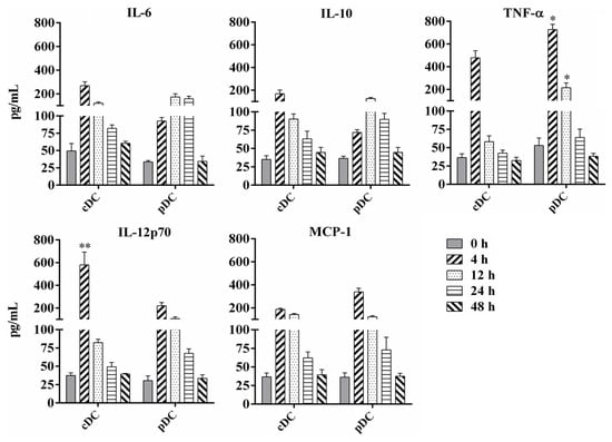 All experiments were repeated at least three times with consistent results, and statistical comparison of the results of cDC and pDC at one time point was performed using an unpaired Student’s t-test using Prism 6 software (GraphPad Inc., San Diego, CA, USA). Values are expressed as mean ± SD, and p < 0.05 was considered to indicate significant difference (*), while p < 0.01 was considered to indicate very significant difference (**).