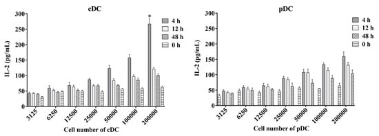 Antigen-presenting activity of mouse splenic cDC and pDC measured using the ex vivo assay. Murine splenic cDCs and pDCs from mice immunized with the mycobacteria-derived Ag85A protein at different time points were used to directly stimulate DE10, a T cell hybridoma, at 37 °C with 5% CO2 for 24 h. The amount of IL-2 in culture supernatants was determined using sandwich ELISA and a standard curve generated from recombinant IL-2. The experiment was repeated two times and data are shown with the mean value of the two independent experiments. * p < 0.05.