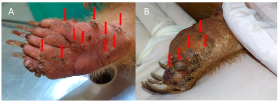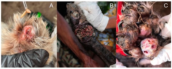 Therefore, controlling T. penetrans fleas in animals can directly contribute to the prevention of human tungiasis [21], since animals favor the transmission and persistence of fleas in the environment [15,22]. In Brazil, dogs are considered one of the main carriers of fleas in the environment, while in African countries, pigs play this role [8,12]. As mentioned above, after the maturation of the eggs in the lesions present in the parasitized hosts, the eggs are released into the environment, perpetuating the life cycle of fleas [15,16,17,18,19,20,21]. Due to the close relationship of environmental sharing between these animal species and humans, people are more exposed to tungiasis in places where infected hosts are present. These factors demonstrate the importance of treating infected animals, since reducing this parasitism will consequently reduce cases in humans, since there will be less or even no dispersal of fleas, which are the causative agents of tungiasis [2,8]. This would be a good strategy for public health authorities, through policies to control fleas in potential animal reservoirs. However, such policies cannot exclude other risk factors for tungiasis, such as poor housing conditions, substandard community hygiene, and traditional techniques for treating and controlling tungiasis [2,21,23]. Thus, control must be multifactorial and involve environmental and host control [15]. Manual flea extraction and treatment with topical antibiotic therapy to prevent complications is recommended for humans [3,9,10,11,12,13,14,15,16,17,18,19,20,21,22,23,24]. However, this method does not apply in most cases of animal tungiasis, since most animals are severely parasitized [21,22,23,24,25], as seen in Figure 2.