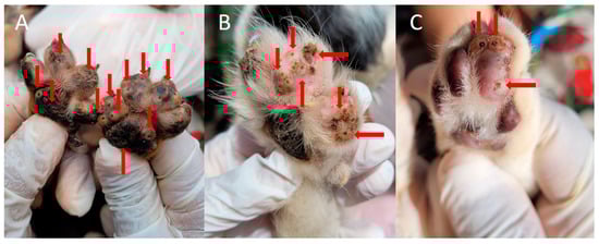 Animals infected with T. penetrans in an endemic community for tungiasis in Brazil. (A) Hind paws of a puppy with numerous viable lesions caused by T. penetrans. (B) Paw of a dog infected with several fleas, arrows demonstrating tungiasis lesions. (C) Cat paw with lesions compatible with viable tungiasis. Photos by Katharine Costa dos Santos.