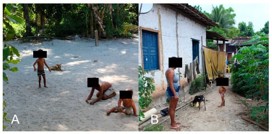 Relationship of environment, animals, and humans in a Brazilian community that is endemic for tungiasis. (A) Barefoot children playing on sandy soil next to a dog with tungiasis. (B) Barefoot child next to an infected dog. Photos by Katharine Costa dos Santos.