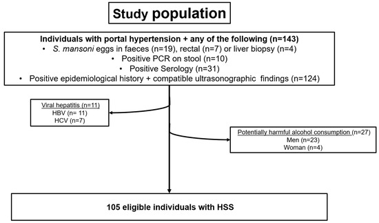 The study group was composed of a retrospective cohort of patients followed in the Gastroenterology and Hepatology Unit of Bonsucesso General Hospital, a Brazilian Ministry of Health tertiary hospital in Rio de Janeiro, Brazil. Patients older than 18 years of age with an HSS diagnosis were included. The diagnosis of Schistosoma mansoni (S. mansoni) infection was based on the identification of characteristic periportal fibrosis by ultrasonography (US) in patients with an epidemiological history of contact with fresh water sources from endemic areas, as well as biochemical criteria (serological and/or coproscopic methods). Patients with viable eggs in feces or tissue biopsy (either liver or bowel) and those with a positive PCR for S. mansoni in stool were treated with Praziquantel.