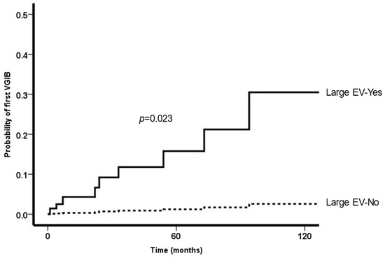 Probability of new-onset VGIB according to the presence of large esophageal varices (adjusted by ALT and Hb levels).