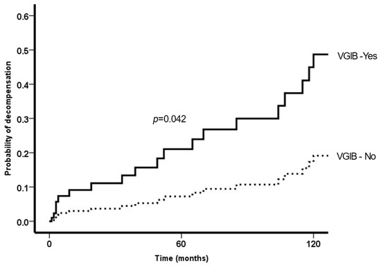 Table 3 shows the baseline factors associated with the development of decompensation. In multivariate analysis, only serum bilirubin and varicose GI bleeding were associated with decompensation. Figure 3 shows the probability of decompensation according to VGIB.