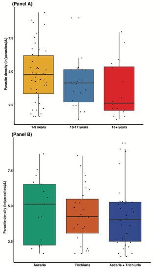 Distribution of parasite density by age group (Panel A) and by type of soil—transmitted helminths (Panel B).