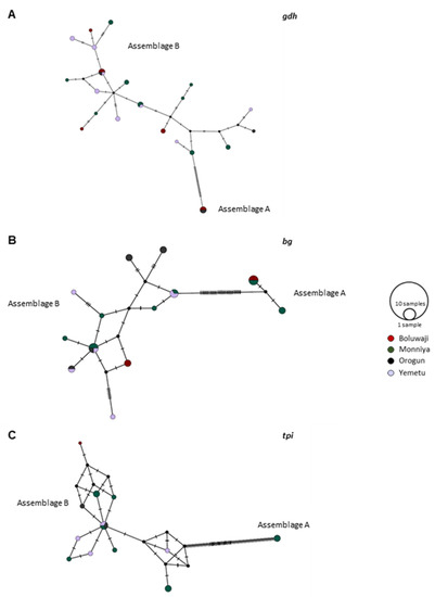 The molecular characterization of microscopy-positive G. duodenalis isolates at the assemblage and sub-assemblage levels is the most important contribution of this study. This is particularly relevant in Nigeria, a country where molecular-based surveys are scarce. Indeed, human genotyping data is only available for five hospital outpatients in Kaduna state, all of them infected by the assemblage A of the parasite [37]. Zoonotic assemblages A and B have also been reported in goats and pigs [46,47] and in farmed rabbits [48]. Our study is also the first investigation adopting an MLST scheme to assess the genetic diversity of G. duodenalis in isolates of human origin, as the only previous survey available used the tpi locus only [37]. Of note, MLST analyses are relevant for investigating the epidemiology of G. duodenalis because they assist in detecting mixed infections involving different assemblages/sub-assemblages of the parasite and in characterizing sources of infection and zoonotic potential [63].