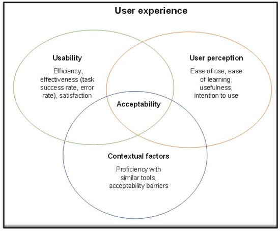 In this study, we researched/explored the following three themes: (1) usability in terms of efficiency, effectiveness, error rate, and satisfaction; (2) user perception in terms of perceived ease of use, perceived ease of learning, perceived usefulness, and intention to use; and (3) contextual factors in terms of barriers to acceptability and proficiency with similar devices, all of which collectively contribute to the overall user experience (Figure 1).