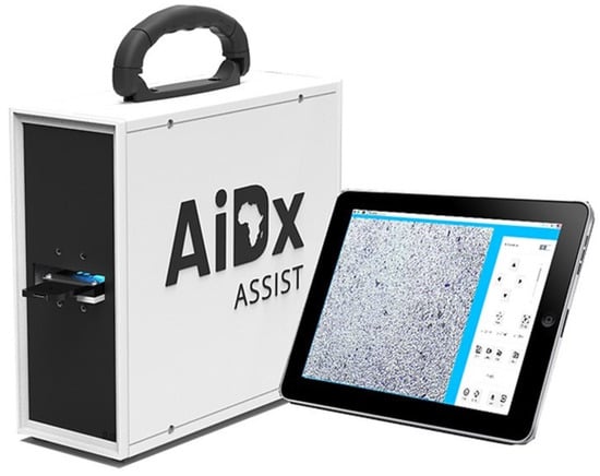 To address these limitations, we designed a new diagnostic device to increase the screening of parasitic NTDs such as lymphatic filariasis, schistosomiasis, and onchocerciasis. This device, the AiDx NTDx Assist machine, is an automated digital microscope designed for the quick detection of parasites in blood and urine. It provides expert-independent analysis and could strengthen task-shifting programs such that non-experts, for instance, community healthcare workers, could be easily trained and empowered to perform quick sample screening for NTDs at the community and primary healthcare level. It has been validated for detection of lymphatic filariasis in Nigeria [7] in lab-based settings. Prepared slides are inserted into the device, patient data is input, and an automatic scan is started. The AiDx device has a processing speed of 10 min per sample, and the outputs of the scan are visually displayed and flagged when microfilaria is detected.