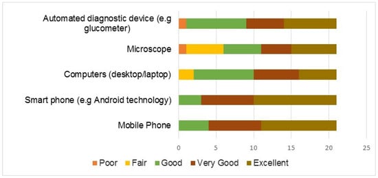 At baseline, all participants had used or had been previously taught how to use the listed devices in Figure 3, so we assessed the extent of proficiency with the devices. Results showed that most of the participants rated their proficiency with similar digital and optical devices as good. Less than 5% of participants had low levels of proficiency with the glucometer and microscope (Figure 3).