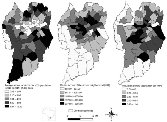 Maps describing the average annual incidence of dog bites per neighborhood (Table S1 [Supplementary Materials]) were constructed using QGIS (Quantum Geographic Information System, version 2.16.1, Open-Source Geospatial Foundation Project). The median income of each neighborhood [16] (Table S3) and the population density per km2 [17] (Table S2) were illustrated to allow a spatial understanding of their relationship with the average annual incidence of dog bites. The victim’s address was assumed as the location where the accident occurred because this location is not a variable present in the PEP reports. Only reports monitoring dog aggressors were considered for analysis to minimize the error likelihood.