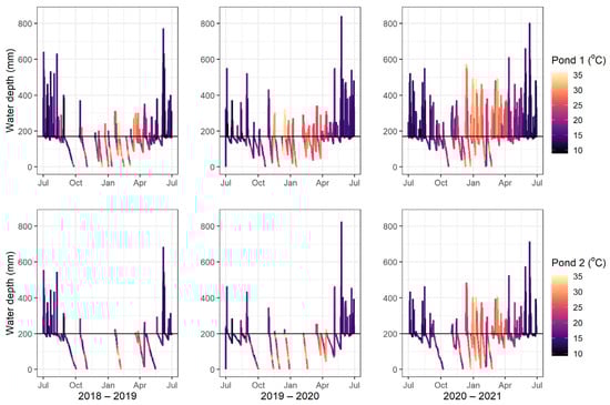 Water depth and daily mean water temperature for waterbody 1 (top) and waterbody 2 (bottom) for each year. The black line indicates the maximum depth of the pool once the river tide height recedes.
