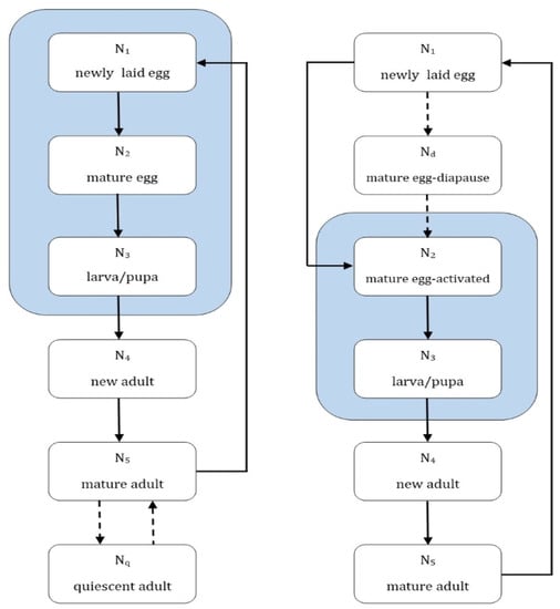 The larval/pupal population is modelled by using the existing population, plus the number of newly hatched eggs, minus deaths due to thermal mortality. Larval/pupal development for all species is modelled using Equation (6), as shown in Figure 6.