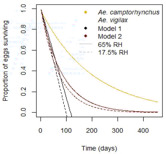 Egg survival in Ae. vigilax depends on relative humidity, H. Two models were tested, one linear, Equations (10) and (11), and one proportional, Equation (12). The first is an additive model, determined by adding the mortality at each timestep, , from the time the egg is laid, . Mortality is equal to the inverse of the lifespan at that humidity, . Mortality is summed to give a survival proportion giving a maximum egg viability of around 100 days. The second model takes the proportion surviving each day but multiplies it, with an adjustment so that the median value is equal to that of the linear model. This gives a longer maximum egg viability and better represents the real distribution of mosquito egg survival times [42,44]. These two survival models are shown for two humidity values, along with the value for Ae. camptorhynchus, in Figure 4.