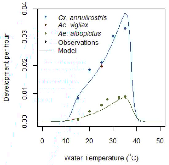 Mortality for all three species was modelled as a quadratic relationship fit to the observed data for Ae. camptorhynchus and Cx. annulirostris. This is likely to be an overestimation of high temperature survival, especially for Cx. annulirostris; however, the increased mortality at temperatures over 35 °C curtails successful development, see Figure 6. No studies have been conducted on Ae. vigilax larval mortality, so observations for Ae. taenirohynchus [52] were used, Figure 6.