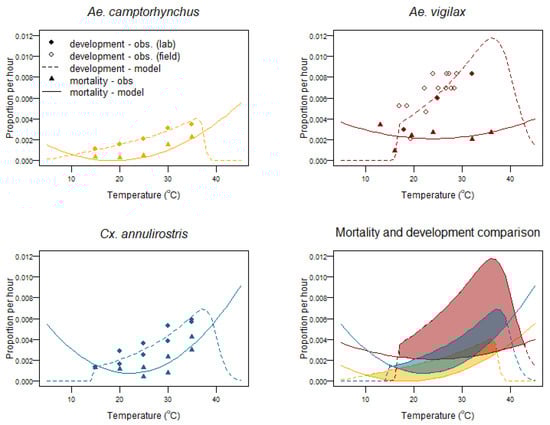 Proportion of mortality and development per hour for Aedes camptorhynchus, Aedes vigilax, and Culex annulirostris larval and pupal stages vs. water temperature—observed values vs. models.