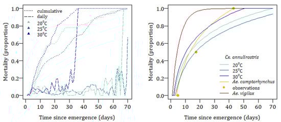 Observed adult daily and cumulative mortality for Cx. annulirostris (left). Modelled cumulative mortality for Aedes camptorhynchus, Aedes vigilax, and Culex annulirostris by time since emergence (right).