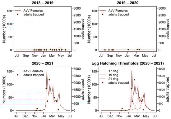 Aedes vigilax eggs exhibit a minimum temperature threshold to commence hatching. Estimates of this vary: maximum air temperature is above 20 °C [82], or daily minimum temperatures above 11.5 °C [43]. Temperatures at the study site can easily exceed 20 °C all year round and have minimum temperatures above those of Sydney, where the previous studies occurred. Weekly mean temperature is less variable. Several hatching thresholds were tested. Ae. camptorhynchus does not have an explicit hatching threshold cited in the literature but a number were tested for this species.