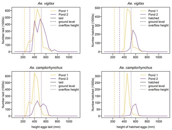 Ae. camptorhynchus lay eggs at the edge or on the water surface, which can then float to the edge of the pool and lodge in the mud, or sink to the water bottom [53] within the preferred vegetation complex [41]. Ae. vigilax have been observed to prefer damp areas in the same habitat. In the model, eggs are laid at the current water height, , plus a random variable with SD 50 mm above the water level, Equation (17).