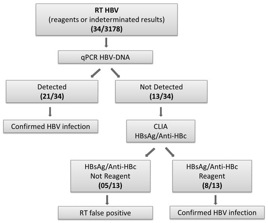 For serological markers of HBV (HBsAg) infection, we employed rapid tests (RT-Vikia™ Biomerieux, Rio de Janeiro, Brazil). After the rapid tests, all the samples were stored at −20 °C and sent to the national reference laboratory—Instituto Adolfo Lutz, São Paulo—for confirmatory testing. Transportation complied with the requirements of the Brazilian Regulatory Agency (Agência Nacional de Vigilância Sanitária—ANVISA). Participants who tested positive for any of the rapid tests were counselled and immediately referred to the STI healthcare reference center in each of the 12 cities. All positive or indeterminate samples for HBsAg were tested for the detection of HBV DNA by Real-Time PCR quantitative assay polymerase chain reaction (qPCR) (Abbott Real-Time HBV). If negative for HBV DNA, samples were tested by chemiluminescence immunoassay (CLIA—ADVIA Centaur CP™, Siemens Healthcare Diagnosis, Berlin, Germany) for HBsAg and total anti-HBc (Figure 1). Negative samples for HBsAg and total anti-HBc were subjected to anti-HBs detection, following manufacturer instructions.