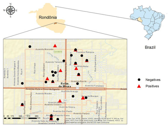 Geographical location of the municipality of Rolim de Moura, state of Rondônia, Brazil. Place of origin of cats and spatial distribution between seropositive and seronegative for anti-T. gondii antibodies.