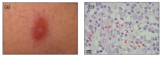 (a) Cutaneous nodular lesion caused by Leishmania infection on the left side of the patient’s chin (24 May 2021). (b) Microscopic appearance of skin lesions with an amastigote form of Leishmania (red arrowheads) (hematoxylin and eosin staining; 1000× magnification).