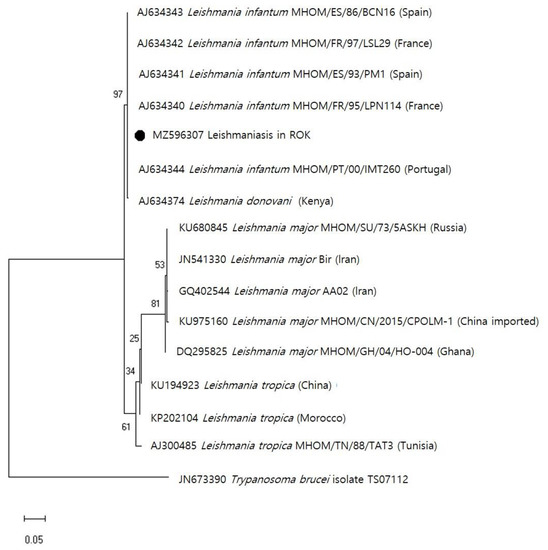 To identify the Leishmania species, skin biopsy samples were collected from the patient at Ajou University Medical Center, and microscopic examinations and genetic analyses were performed at the Korea Disease Control and Prevention Agency (KDCA). DNA was extracted from the patient’s skin lesion using a DNeasy Blood and Tissue Kit (Qiagen GmbH, Hilden, Germany) and the Leishmania internal transcribed spacer 1 and 5.8 S ribosomal RNA genes were detected based on PCR analysis [16,17]. For species identification, a phylogenetic analysis was performed using the maximum likelihood method to identify the best tree. Analysis was conducted using MEGA software (Pennsylvania State University, State College, PA, USA) version 6, and bootstrap scores were calculated for 1000 replicates. The obtained sequence (314 bp; GenBank accession No. MZ596307) was identified based on a BLAST search. The sequence clustered with L. infantum (GenBank accession number: AJ634340-AJ634344) with 100% alignment. These clusters contained L. infantum that have been isolated from patients in different regions (the sequences of which are available in GenBank), including Spain (MHOM/ES/93/PM1; AJ634341, MHOM/ES/86/BCN16; AJ634343), France (MHOM/FR/95/LPN114; AJ634340, MHOM/FR/97/LSL29; AJ634342), and Portugal (MHOM/PT/00/IMT260; AJ634344) (Figure 2). Having been diagnosed with L. infantum-caused CL, the patient underwent surgical excision and was treated with liposomal amphotericin B at a dose of 3 mg/kg for 15 days. The patient experienced no other side-effects during treatment. The lesion was treated, and no recurrence has been reported.