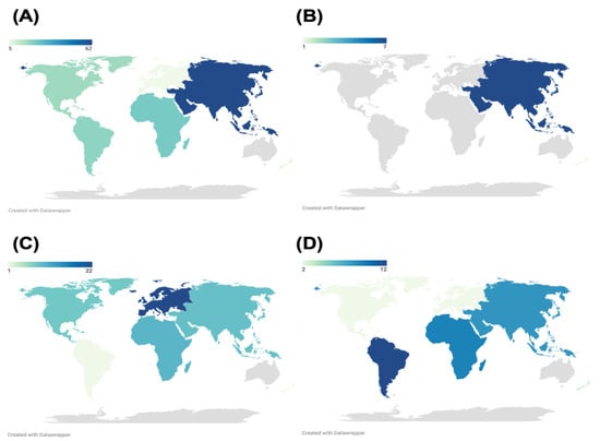 Distribution of flavivirus seroprevalence studies by region: (A) DENV, (B) JEV, (C) WNV, (D) ZIKV.