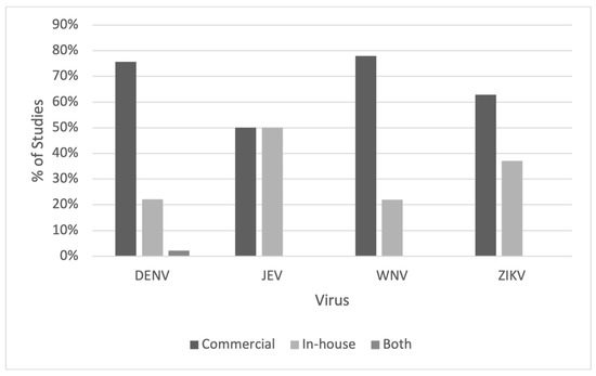 In this review, it was found that researchers used commercial kits more often, except for JEV, for which commercially available ELISAs and in-house assays were used equally. The benefits of using commercial kits for most non-endemic settings are obvious, since they are readily available and easy to use, and researchers need not develop or purchase their antigens and antibodies. Further, in-house assays need to be validated in terms of their diagnostic performance before use, whereas these data are usually already reported for commercial kits. However, there are still instances in which the use of in-house assays would be preferred. For example, in this study, the top countries/territories that used in-house ELISAs were Thailand, French Polynesia, and Brazil, which are all areas in which multiple flaviviruses are prevalent. In-house assays in these settings are advantageous, since they would be more cost-effective when testing a huge volume of sera. This may be the case in endemic areas where a large portion of the population is potentially affected. For these countries, seroprevalence testing may also be performed for multiple flaviviruses at the same time, so in-house assays would allow researchers to standardize the assay format and serum dilutions for all viruses to be tested against, allowing findings to be readily comparable. Further, the validation step for in-house assays is useful for determining an optimal cut-off value for the positive-to-negative (P/N) ratio. In areas in which multiple flaviviruses co-circulate, more cross-reactive antibodies in the sera are expected, and thus more background noise in ELISA assays, compared to sera from non-endemic regions. This means set cut-off values as used in commercial kits may not readily be applicable. This limitation could be addressed by using standard sera with known infection or vaccination histories for cut-off setting, but this is not routinely done, as commercial kits often come with packaged controls. In-house assays used in surveillance also benefit from quality assurance performed by national or reference centers to ensure protocol standardization as recommended by the WHO [68].