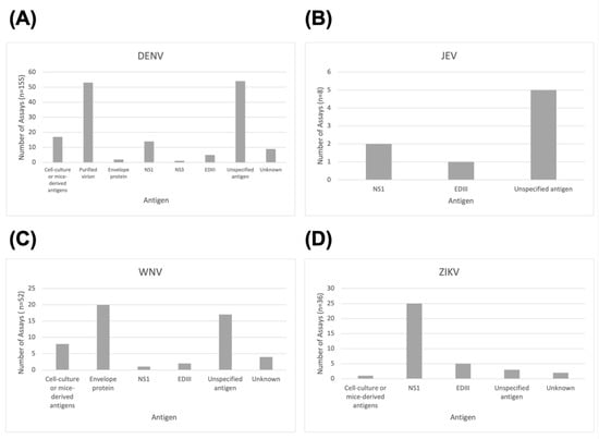 For all viruses except JEV, commercial kits were more frequently used than in-house assays. A small number of studies for DENV (n = 3, 2.2%) used both commercial and in-house ELISAs (Figure 3). Figure 4A shows that the dominant antigens used for DENV assays are purified virions (n = 53, 34.19%) or unspecified antigens (n = 54, 34.84%). Most of these were from commercial test kits that do not detail how antigens are prepared for their ELISAs. This is also the case for JEV (Figure 4B), for which most studies with unspecified antigens used commercial assays. For ZIKV (Figure 4C), the NS1 antigen was most commonly used (n = 25, 69.44%), whereas for WNV (Figure 4D), 38.46% (n = 20) of the antigens used in ELISA assays included the envelope protein.