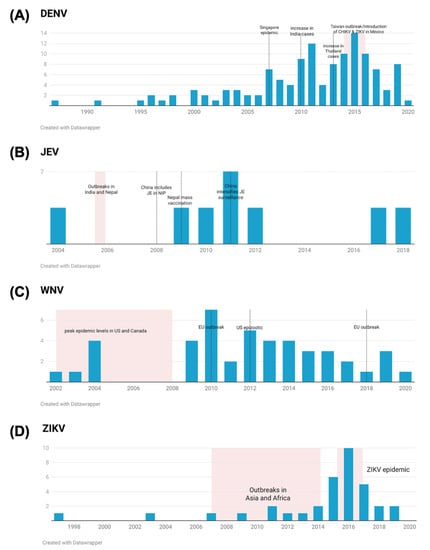 Flaviviruses are a group of virus species that belong to the genus Flavivirus and the family Flaviviridae [1]. Through their mosquito vectors, flaviviruses such as dengue virus (DENV), Zika virus (ZIKV), Japanese encephalitis virus (JEV), and West Nile Virus (WNV) are transmitted to humans and cause disease. They are also among the most important flaviviruses based on occurrence and disease impact [2]. Though there are many medically important flaviviruses that affect humans, DENV, JEV, and WNV are known to be established threats, since they cause the most number of infectious and are widespread globally [3]. Meanwhile, ZIKV is a flavivirus of interest, since its recent re-emergence brought about millions of infections that increased the global distribution of this virus [3,4]. In tropical and subtropical countries, these flaviviruses are major public health threats [5]. However, in recent years, these viral infections have also become a medical concern for temperate regions [6,7,8]. Arboviruses such as Yellow fever virus (YFV), Powassan virus, Usutu virus, tick-borne encephalitis virus, and Ilheus virus, among others, have a more limited geographic distribution and disease burden and are not included in this review.